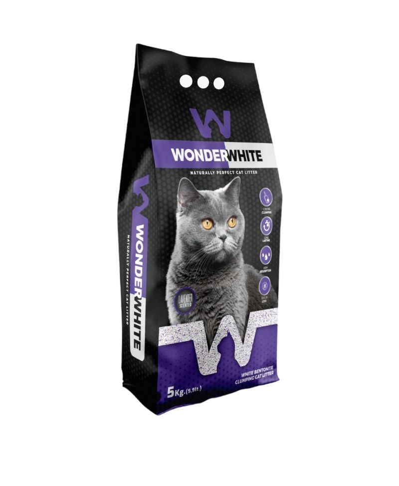 Privalumai: „Wonder White Levander” bentonitinis kačių kraikas yra iki 99,5% be dulkių. Greitai sugeriantis katės šlapimą ir nemalonius kvapus. Neprilimpantis prie katės letenėlių.